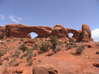 Met de auto maken we nog een loop langs allerlei vreemd gevormde bogen en gaten. De hiernaast afgebeelde formatie wordt Windows genoemd. Heeft overigens helemaal niets met Bill Gates te maken. Te voet onderzoeken we een en ander wat nader en schieten wat plaatjes. Inmiddels zijn wij uit de schaduw van de wolk die de hele ochtend boven ons hoofd hing en het is weer heet. |